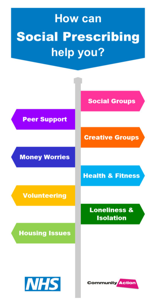 Social prescribing is a person-centred approach focusing on what matters to you. It can support with signposting and accessing organisations and services that could benefit your current situation.
