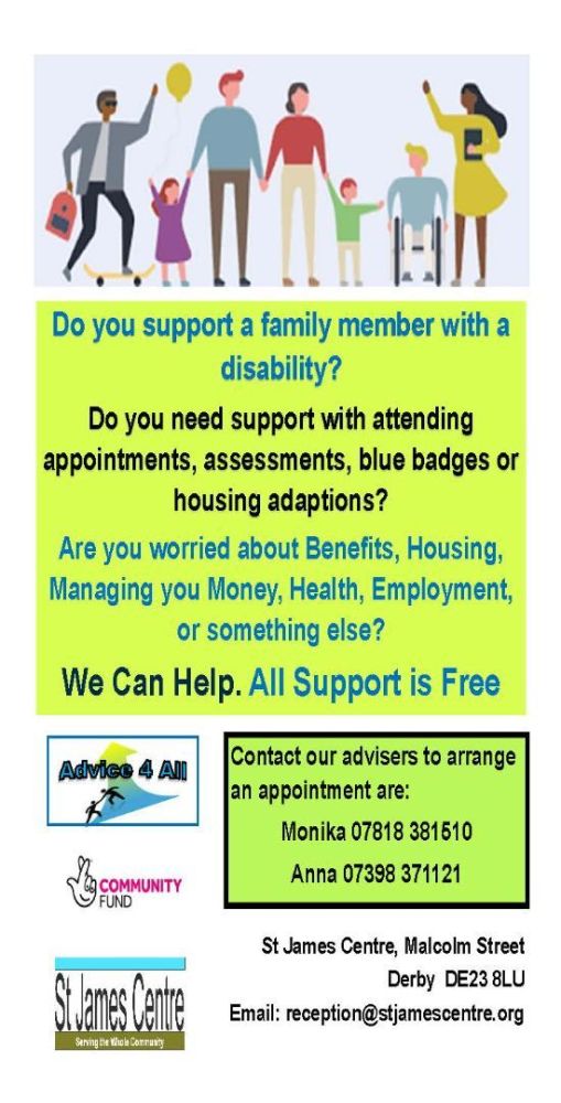 If you support a family member with a disability, or need support attending appointments, or assessments, blue badges or housing adaptations, St James Centre can help!
