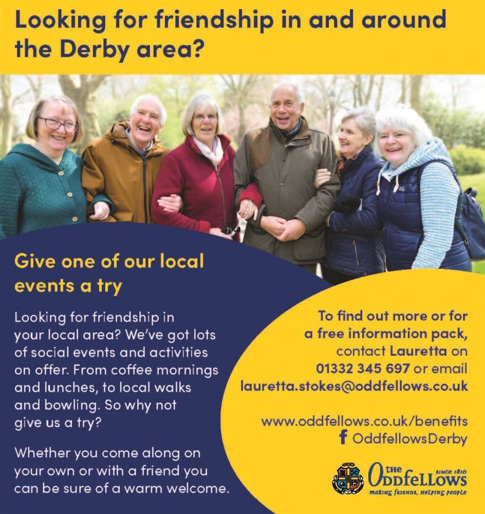 To receive a free information pack and a diary of Derby Oddfellows' upcoming events, contact Lauretta at lauretta.stokes@oddfellows.co.uk or call 01332 345697.