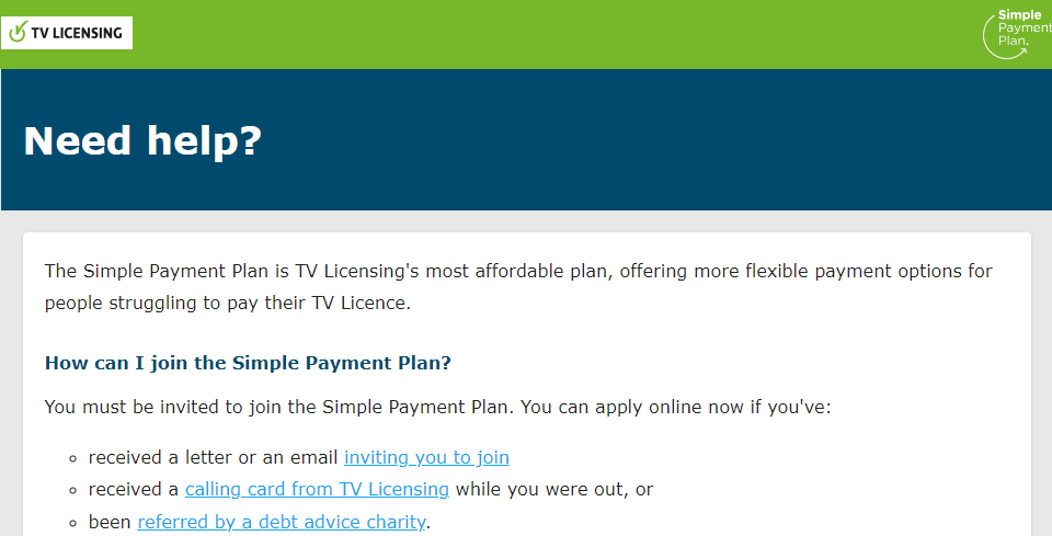For more information about the Simple Payment Plan visit: www.tvlicensing.co.uk/faqs/FAQ305