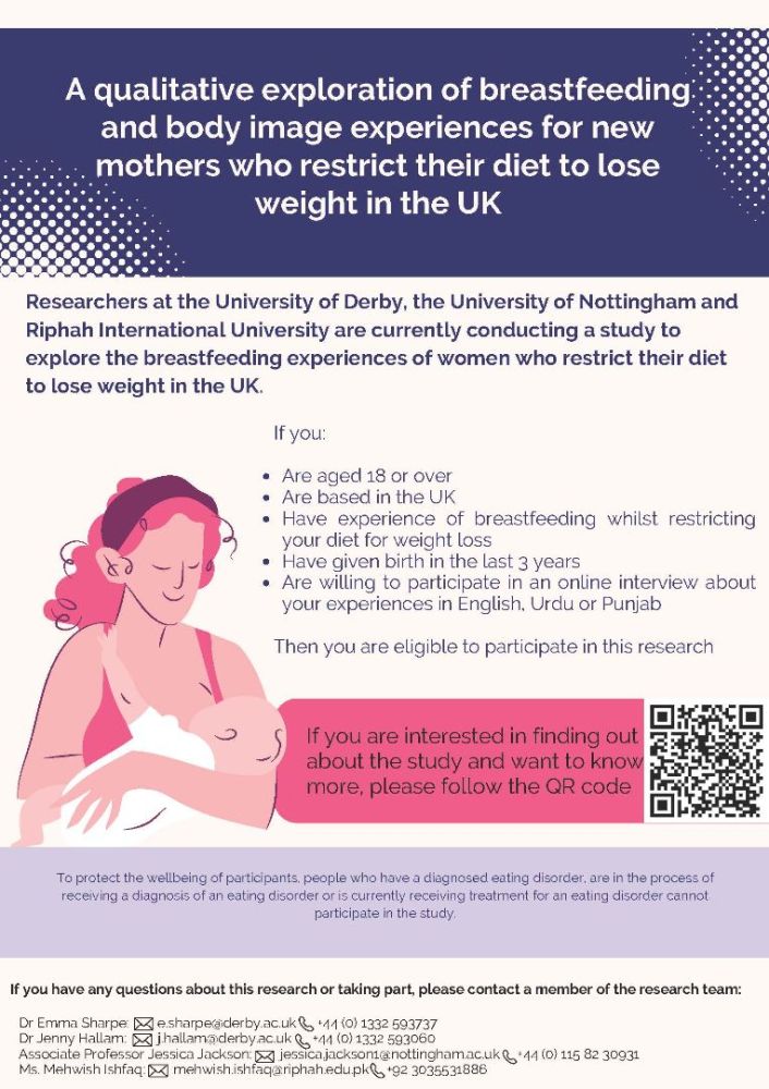 Researchers at the University of Derby, the University of Nottingham and Riphah International University is currently conducting a study to explore the breastfeeding experiences of women who restrict their diet to lose weight in the UK.