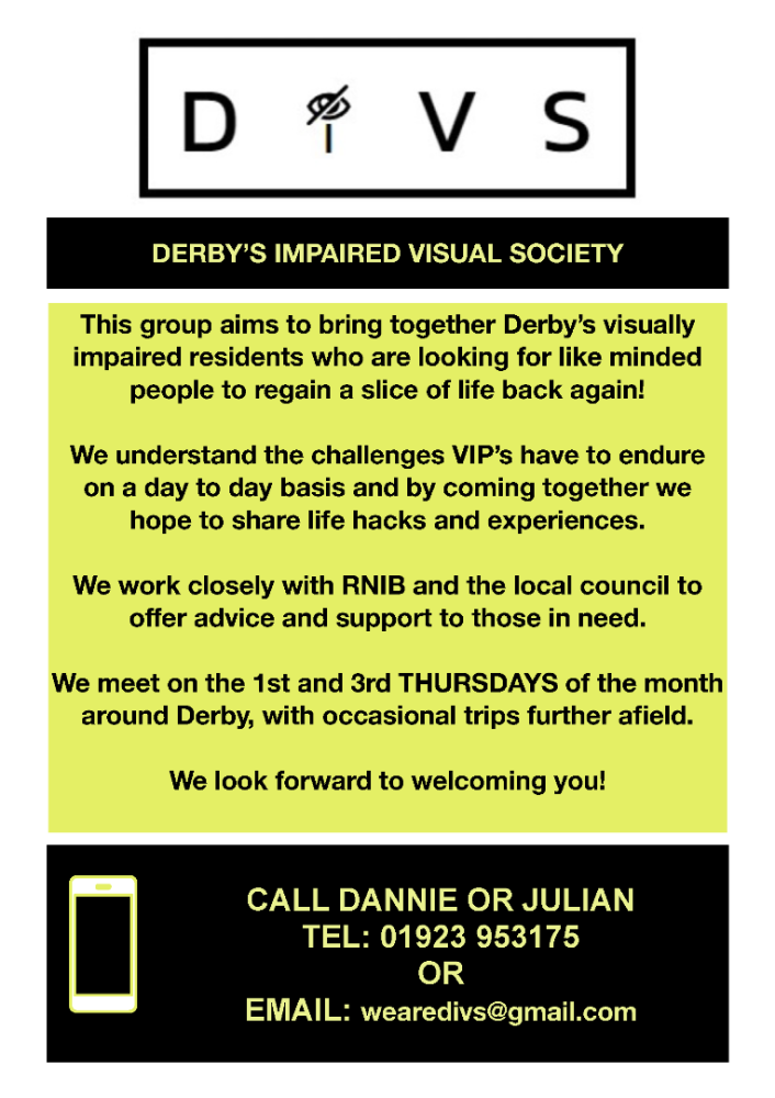 Derby’s Impaired Visual Society (DIVS) aims to bring together Derby’s visually impaired residents who are looking for like-minded people to regain a slice of life back again!