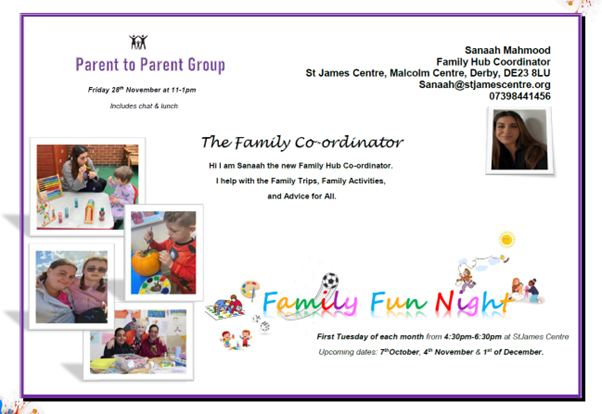 For more information, contact Sanaah Mahmood, the St James Centre's new Family Hub Coordinator: Email Sanaah@stjamescentre.org or call 07398441456.