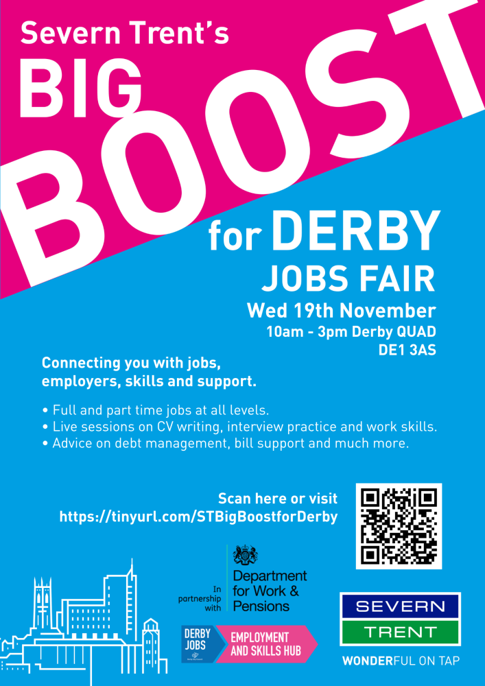 Severn Trent is hosting the Big Boost for Derby, a free jobs fair taking place at Derby QUAD on Wednesday 19 November 2025, from 10:00am to 3:00pm.